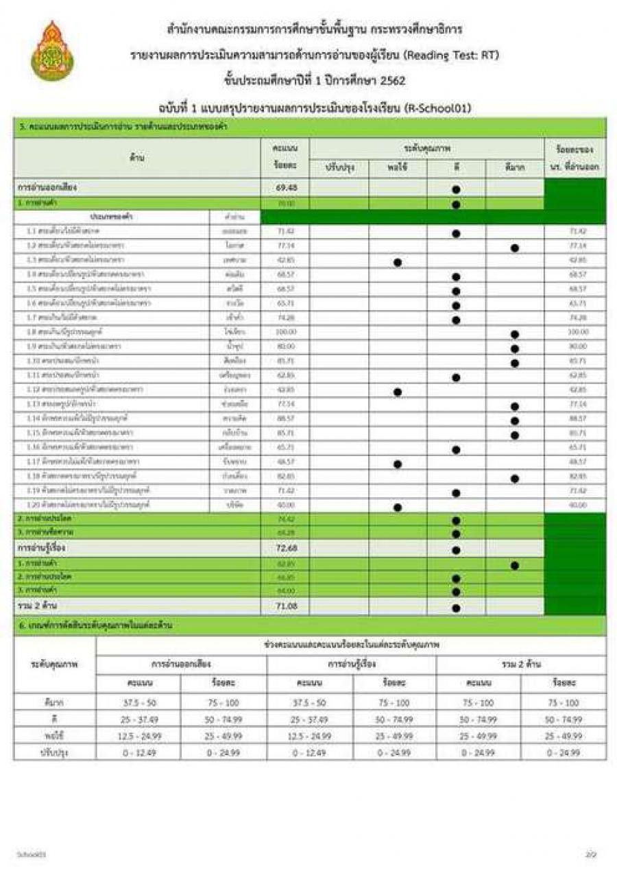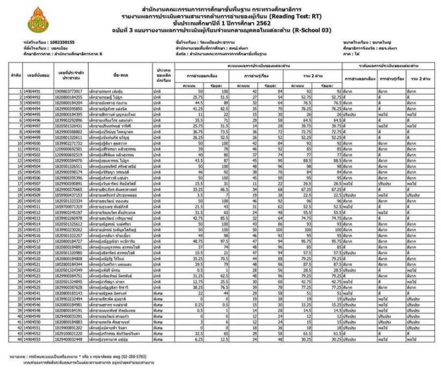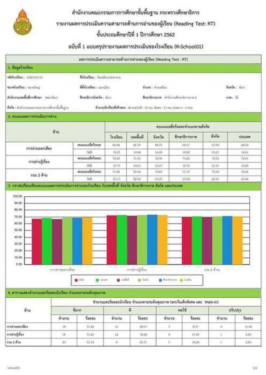 20 มีนาคม 2563 (Reading Test : RT) ชั้นประถมศึกษาปีที่ 1 ปีการศึกษา 2562 สมรรถนะการอ่านออกเสียง และ สมรรถนะการอ่านรู้เรื่อง