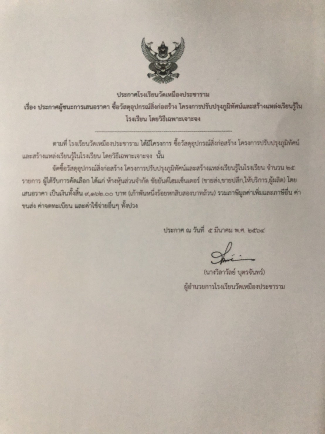 ประกาศโรงเรียนวัดเหมืองประชาราม เรื่อง ประกาศผู้ชนะการเสนอราคา ซื้อวัสดุอุปกรณ์สิ่งก่อสร้าง โครงการปรับปรุงภูมิทัศน์และสร้างแหล่งเรียนรู้ในโรงเรียน โดยวิธีเฉพาะเจาะจง