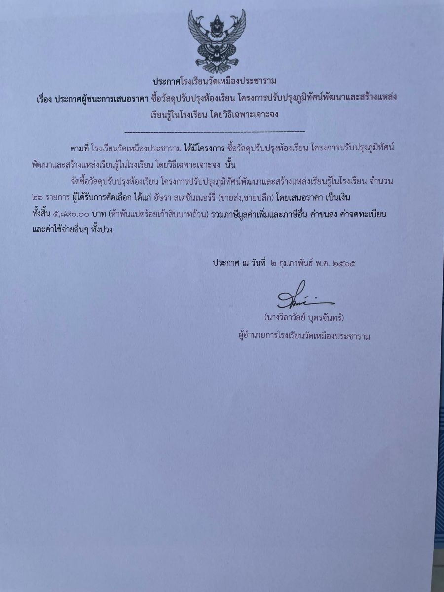 ประกาศโรงเรียนวัดเหมืองประชาราม เรื่อง ประกาศผู้ชนะการเสนอราคา ซื้อวัสดุปรับปรุงห้องเรียน โครงการปรับปรุงภูมิทัศน์พัฒนาและสร้างแหล่งเรียนรู้ในโรงเรียน โดยวิธีเฉพาะเจาะจง
