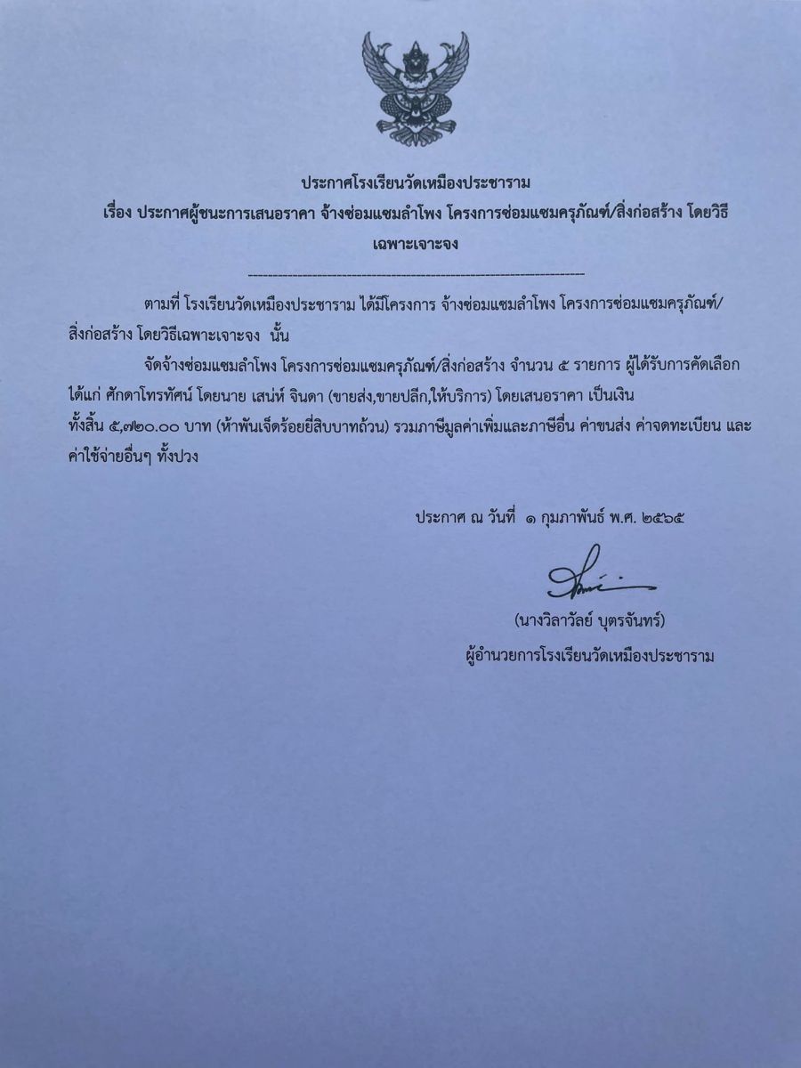 ประกาศโรงเรียนวัดเหมืองประชาราม เรื่อง ประกาศผู้ชนะการเสนอราคา จ้างซ่อมแซมลำโพง โครงการซ่อมแซมครุภัณฑ์/สิ่งก่อสร้าง โดยวิธีเฉพาะเจาะจง