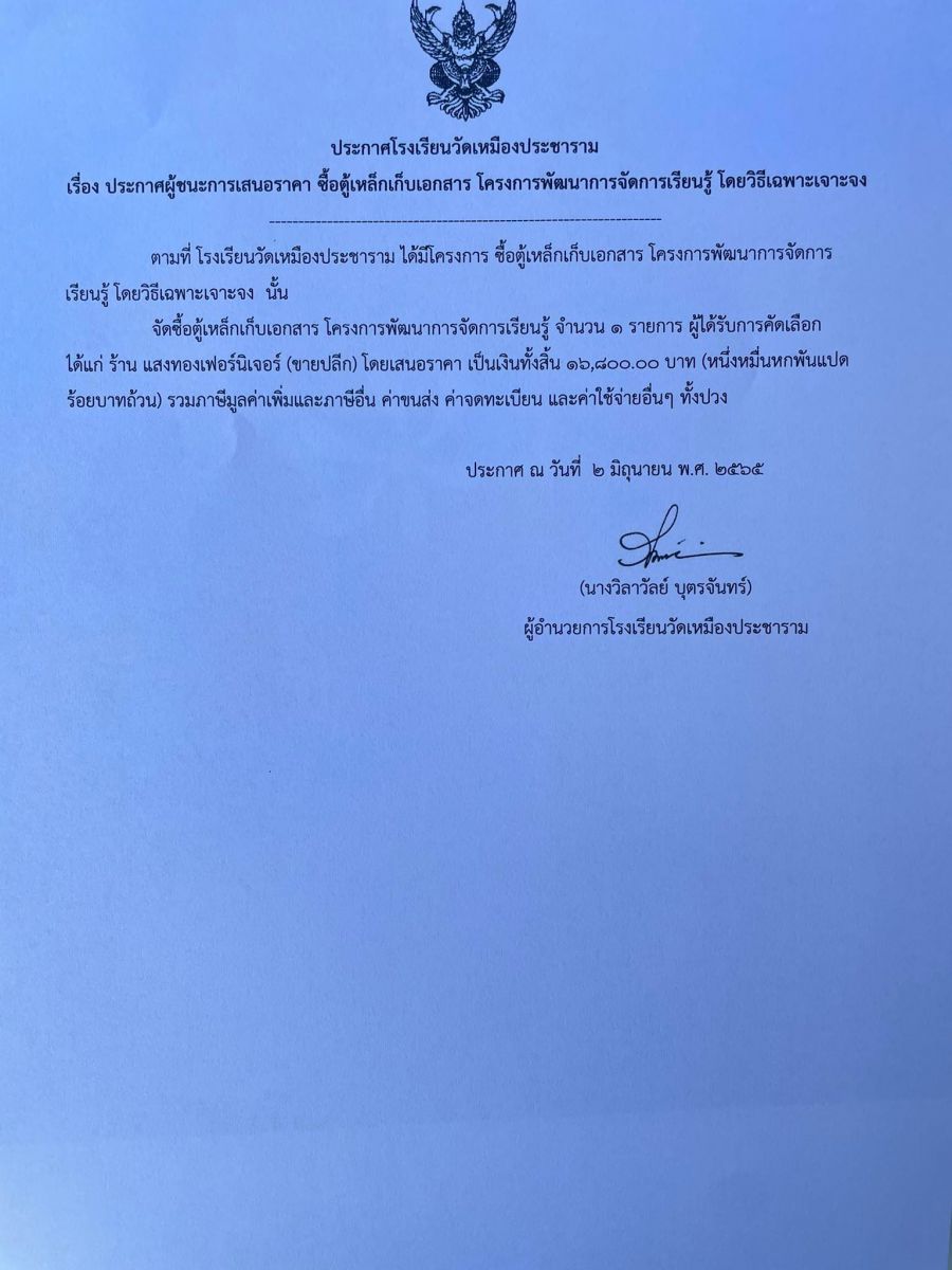 ประกาศโรงเรียนวัดเหมืองประชาราม เรื่อง ประกาศผู้ชนะการเสนอราคา ซื้อตู้เหล็กเก็บเอกสาร โครงการพัฒนาการจัดการเรียนรู้ โดยวิธีเฉพาะเจาะจง