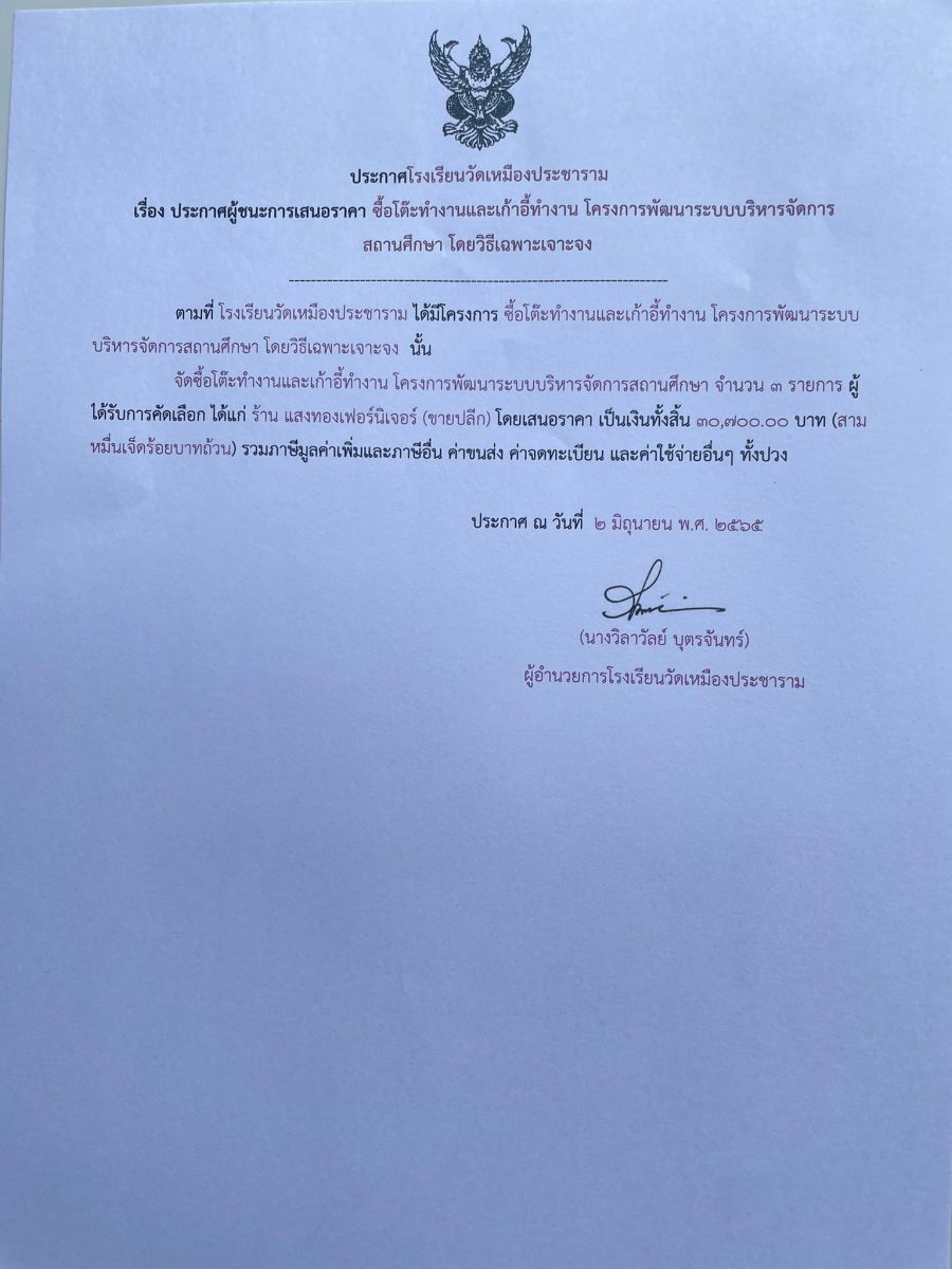 ประกาศโรงเรียนวัดเหมืองประชาราม เรื่อง ประกาศผู้ชนะการเสนอราคา ซื้อโต๊ะทำงานและเก้าอี้ทำงาน โครงการพัฒนาระบบบริหารจัดการสถานศึกษา โดยวิธีเฉพาะเจาะจง
