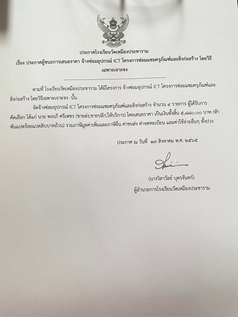 ประกาศโรงเรียนวัดเหมืองประชาราม เรื่อง ประกาศผู้ชนะการเสนอราคา จ้างซ่อมอุปกรณ์ ICT โครงการซ่อมแซมครุภัณฑ์และสิ่งก่อสร้าง โดยวิธีเฉพาะเจาะจง