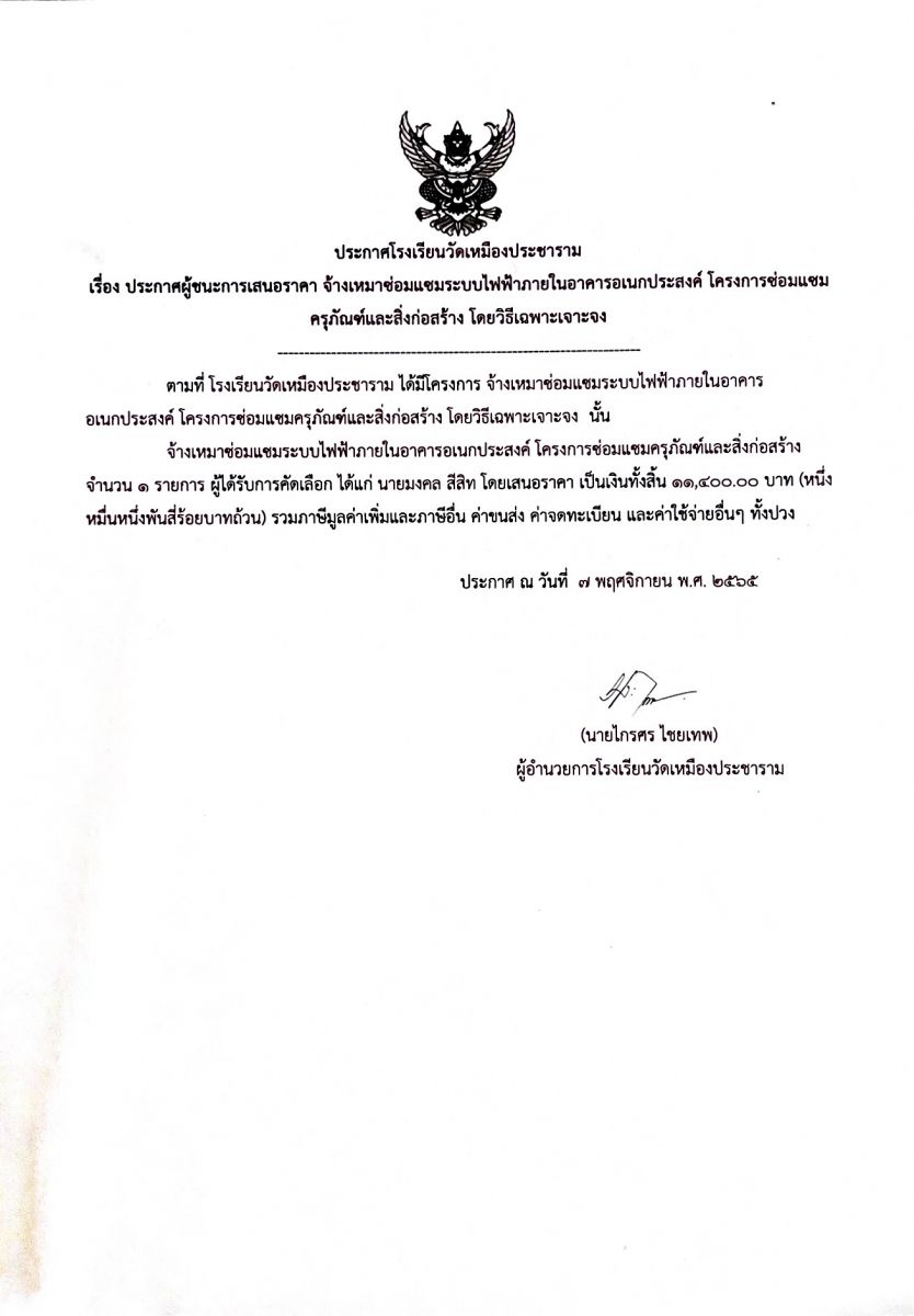 ประกาศโรงเรียนวัดเหมืองประชาราม เรื่องประกาศผู้ชนะการเสนอราคา จ้างเหมาซ่อมแซมระบบไฟฟ้าภายในอาคารอเนกประสงค์ โครงการซ่อมแซมครุภัณฑ์และสิ่งก่อสร้าง โดยวิธีเฉพาะเจาะจง