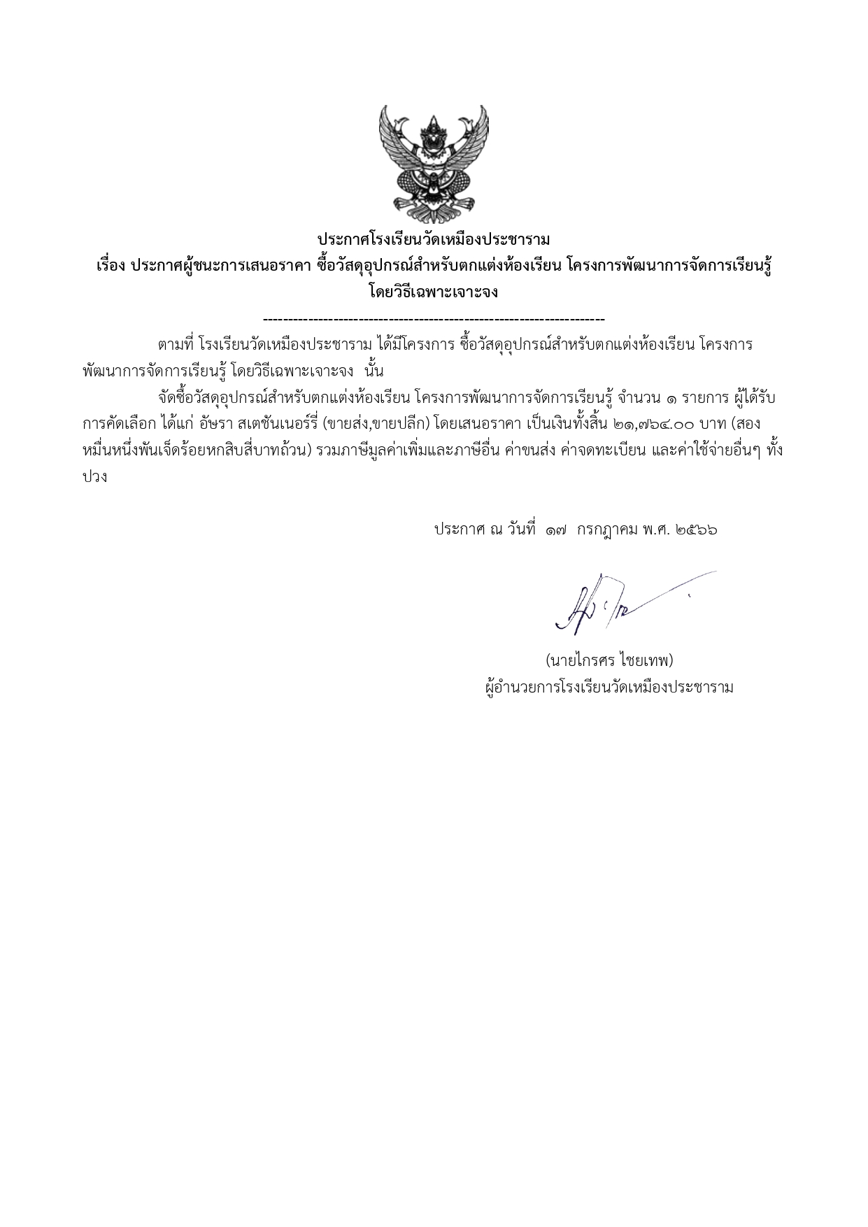 ประกาศโรงเรียนวัดเหมืองประชาราม เรื่อง ประกาศผู้ชนะการเสนอราคา ซื้อวัสดุอุปกรณ์สำหรับตกแต่งห้องเรียน โครงการพัฒนาการจัดการเรียนรู้ โดยวิธีเฉพาะเจาะจง