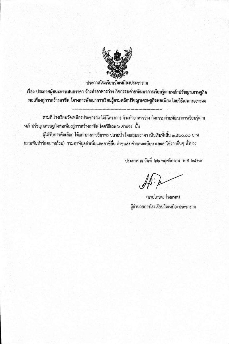 ประกาศผู้ชนะการเสนอราคา จ้างทำอาหารว่างกิจกรรมค่ายพัฒนาการเรียนรู้ตามหลักปรัชญาเศรษฐกิจพอเพียง