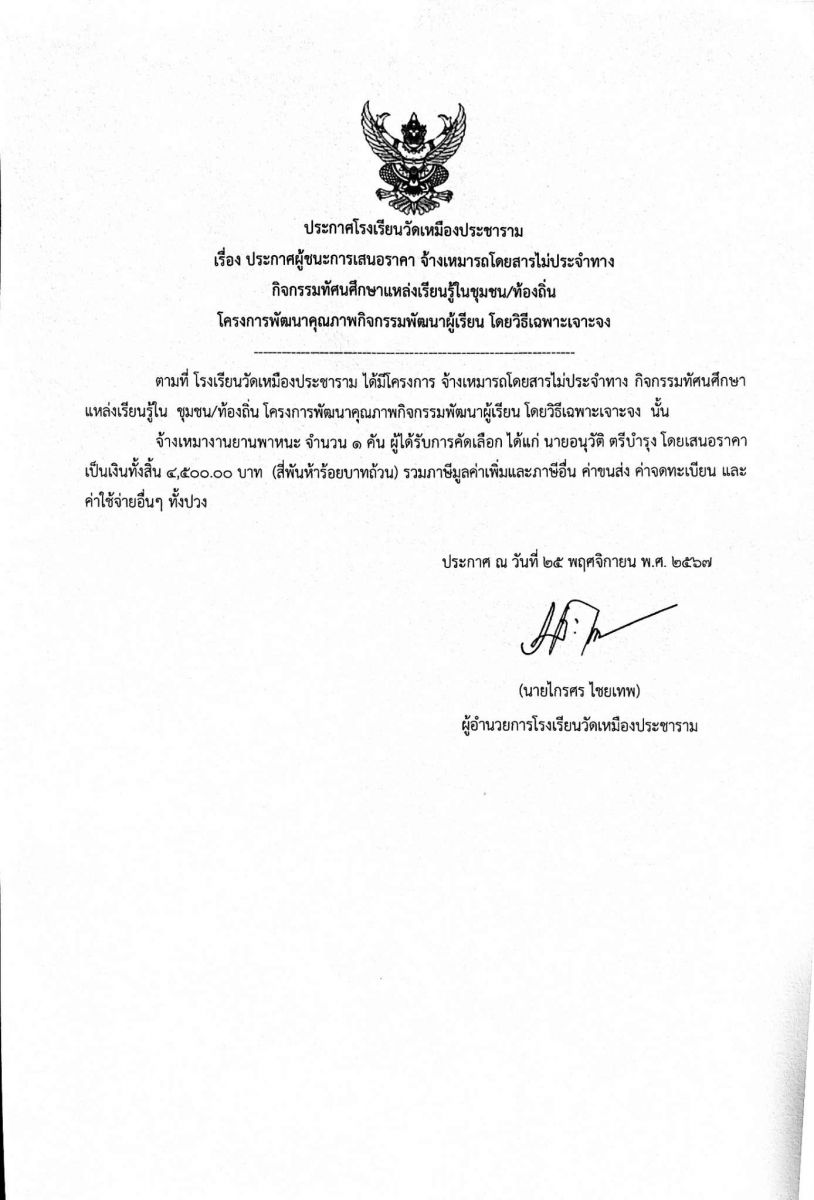 ประกาศผู้ชนะการเสนอราคา จ้างเหมารถโดยสารไม่ประจำทาง