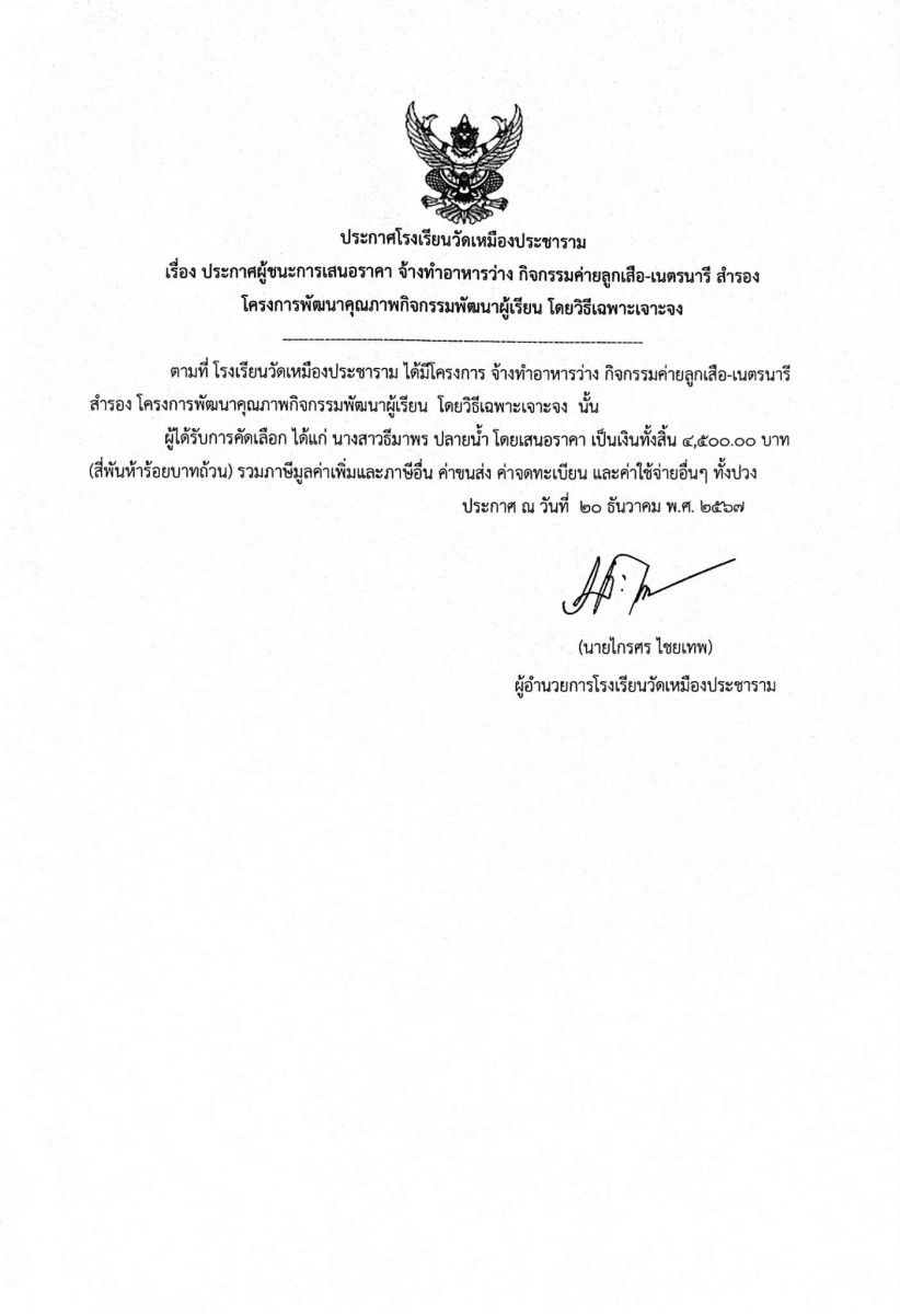 ประกาศผู้ชนะการเสนอราคา จ้างทำอาหารว่างกิจกรรมค่ายลูกเสีย - เนตรนารี สำรอง